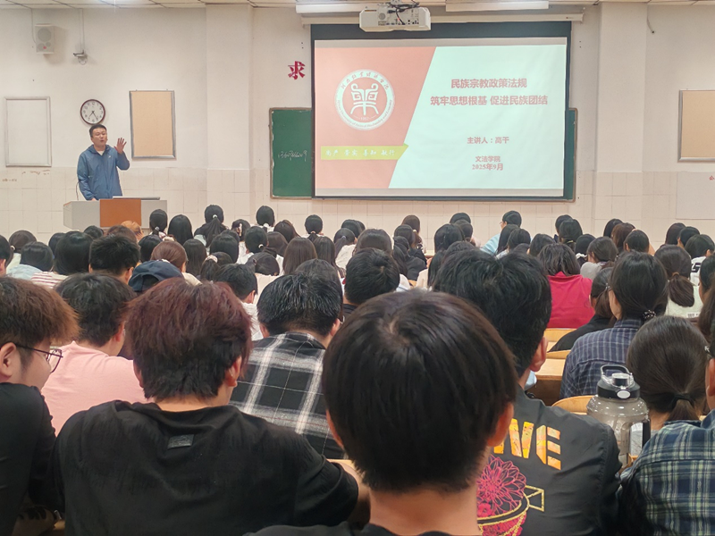 为帮助新生树立正确的民族宗教观念,增强法律意识,9月29日晚,文法学院在W309教室举行了2025级文法学院2025级新生入学教育系列活动(十)——筑牢思想根基 促进民族团结。本次活动由文法学院辅导员高干主讲,2025级全体新生参加。