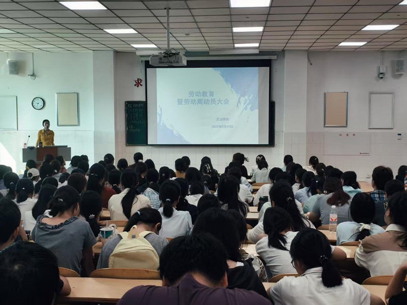 为全面贯彻新时代党的教育方针,构建德智体美劳全面培养的教育体系,引导广大学生树立正确的劳动观念,2025年9月30日上午10点在W309教室举行了文法学院2025级新生入学教育系列活动第十四讲——劳动教育暨劳动周动员大会,会议由文法学院2025级新生辅导员王斯琪主讲,2025级全体新生参加。