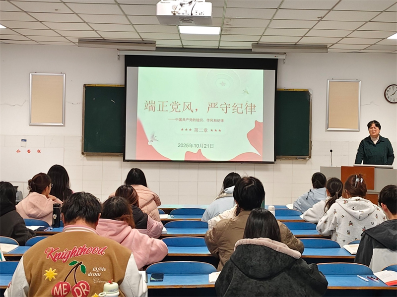 为进一步加强入党积极分子的思想政治教育,提升党性修养与政治素质,文法学院于10月21日晚上八点在E106教室举办了2025年第二期入党积极分子培训第四讲——党的作风建设。本次党课由文法学院副院长王伟琴主讲,全体入党积极分子参加。