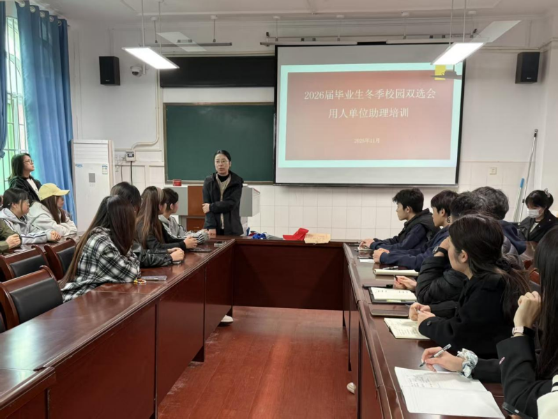 为保障“豫荐未来 青春启航”——河南省2025年高校毕业生等青年就业服务攻坚行动暨河南牧业经济学院2026届毕业生冬季校园双选会顺利举办,提升会务服务质量与效率,11月12日,就业创业中心与文法学院联合组织开展专项培训活动,本次会议由就业创业中心就业服务部主任潘颖主讲,50名会务助理全程参与,为即将到来的双选会筑牢服务根基。