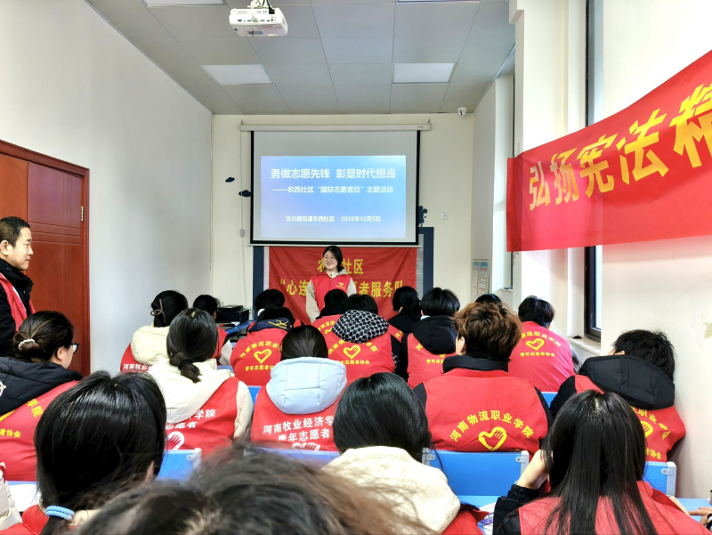 为弘扬和践行“奉献 友爱 互助 进步”的志愿服务精神,努力实现“学习雷锋 奉献他人 提升自己”的宗旨。在12月正值宪法日与国际志愿者日交汇之际,河南牧业经济学院文法学院环手爱青年志愿者服务队以“红马甲在行动”为主题,走进农西社区开展志愿服务,活动全程紧凑且富有意义。