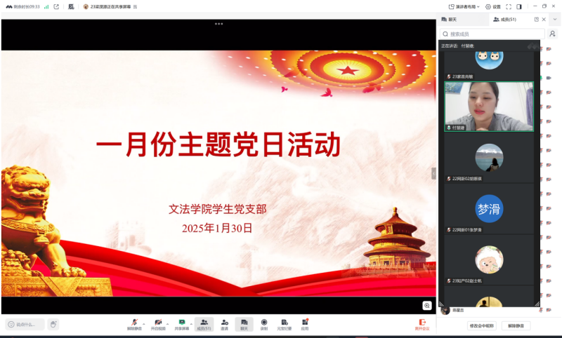 为深入学习贯彻党中央经济工作会议精神,提升党员思想政治建设和科学素养,加强对未来的科学规划与探索,文法学院学生第一、第二党支部于2026年1月30日下午4点通过腾讯会议开展一月份主题党日活动。本次会议由文法学院学生第一党支部书记付慧婕主持,文法学院学生第二党支部书记王兆北和全体学生党员参加。