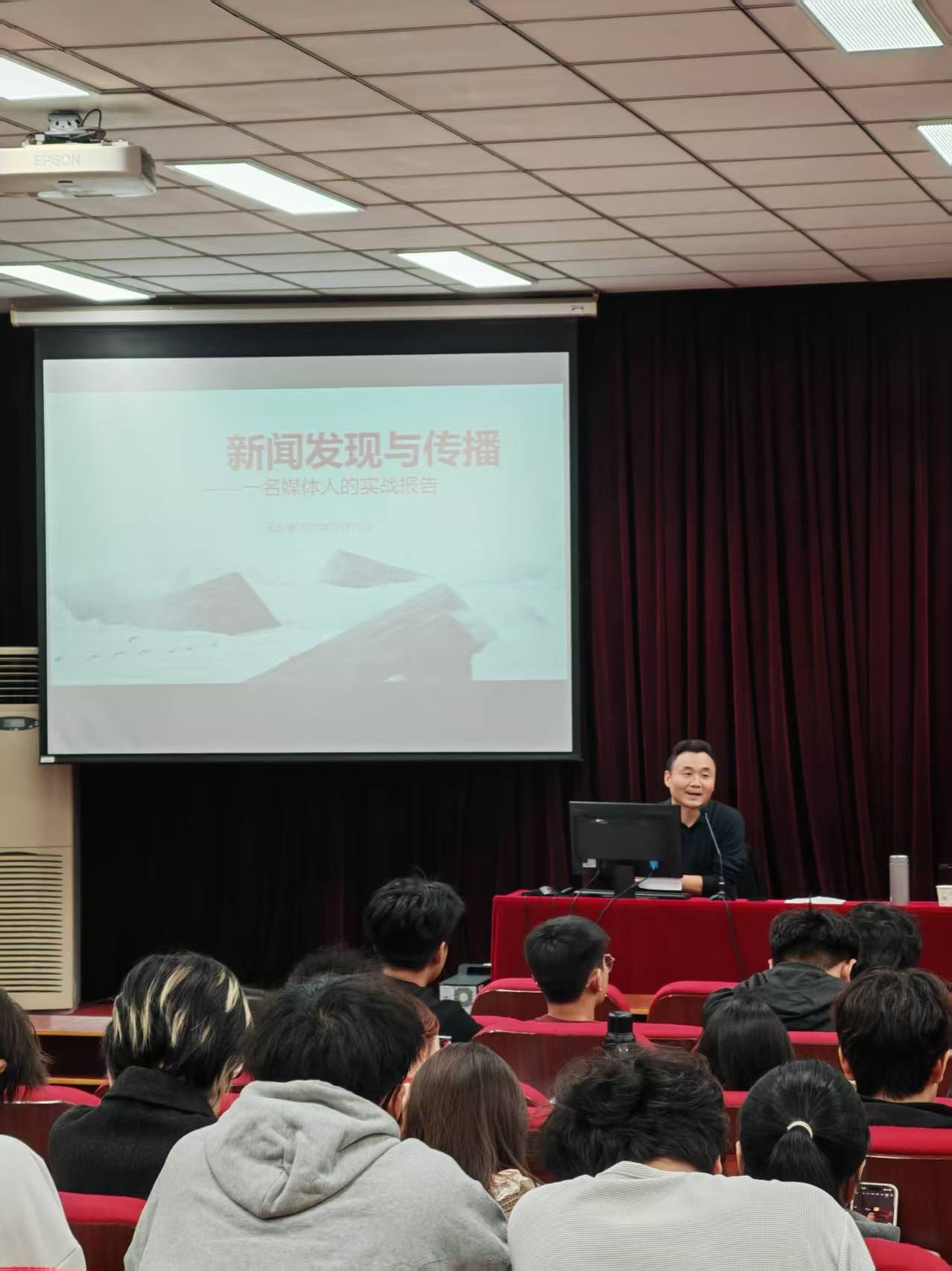 9月16日,正观新闻副总编辑王长善应邀在E109举办题为《新闻发现与传播》的专题讲座。讲座由文法学院副院长魏景霞主持,网络与新媒体教研室教师及24网络与新媒体(网络传播)01、02班学生共同参与。现场互动热烈,王长善通过案例剖析与行业洞察,为师生呈现了一堂兼具理论深度与实践温度的专业课。